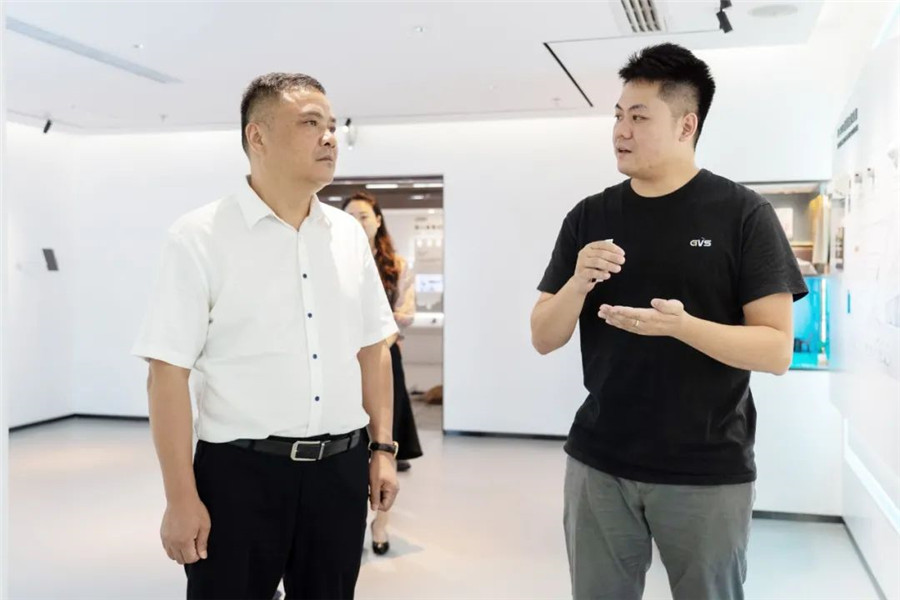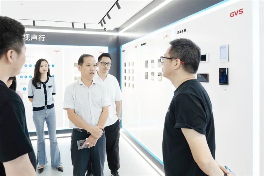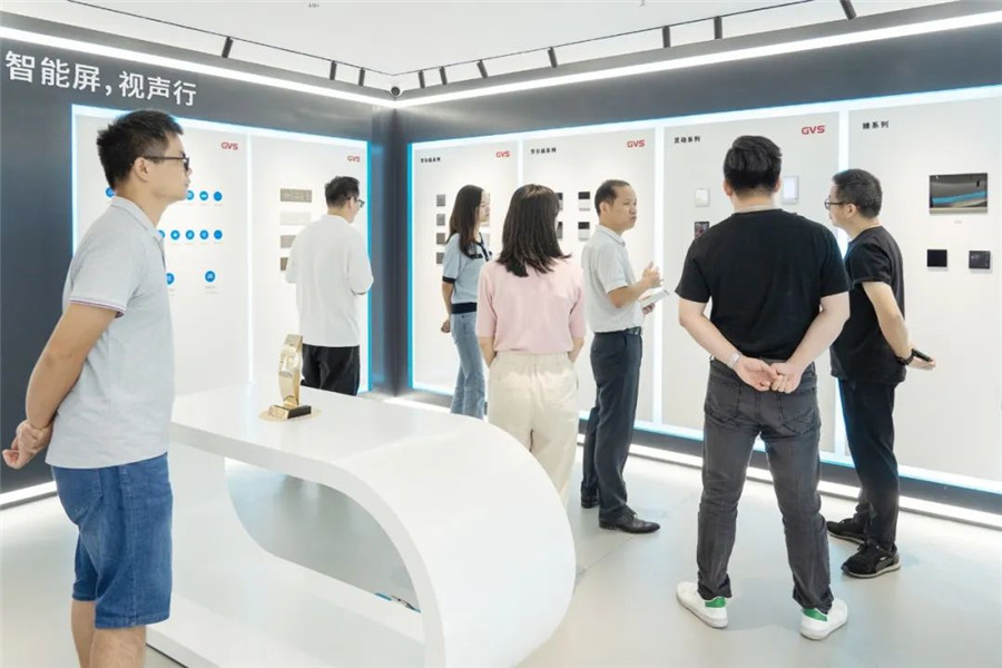 ▲圖為唯康教育團(tuán)隊(duì)在GVS董事長(zhǎng)朱湘軍、總裁彭永堅(jiān)等人的陪同下參觀視聲展廳