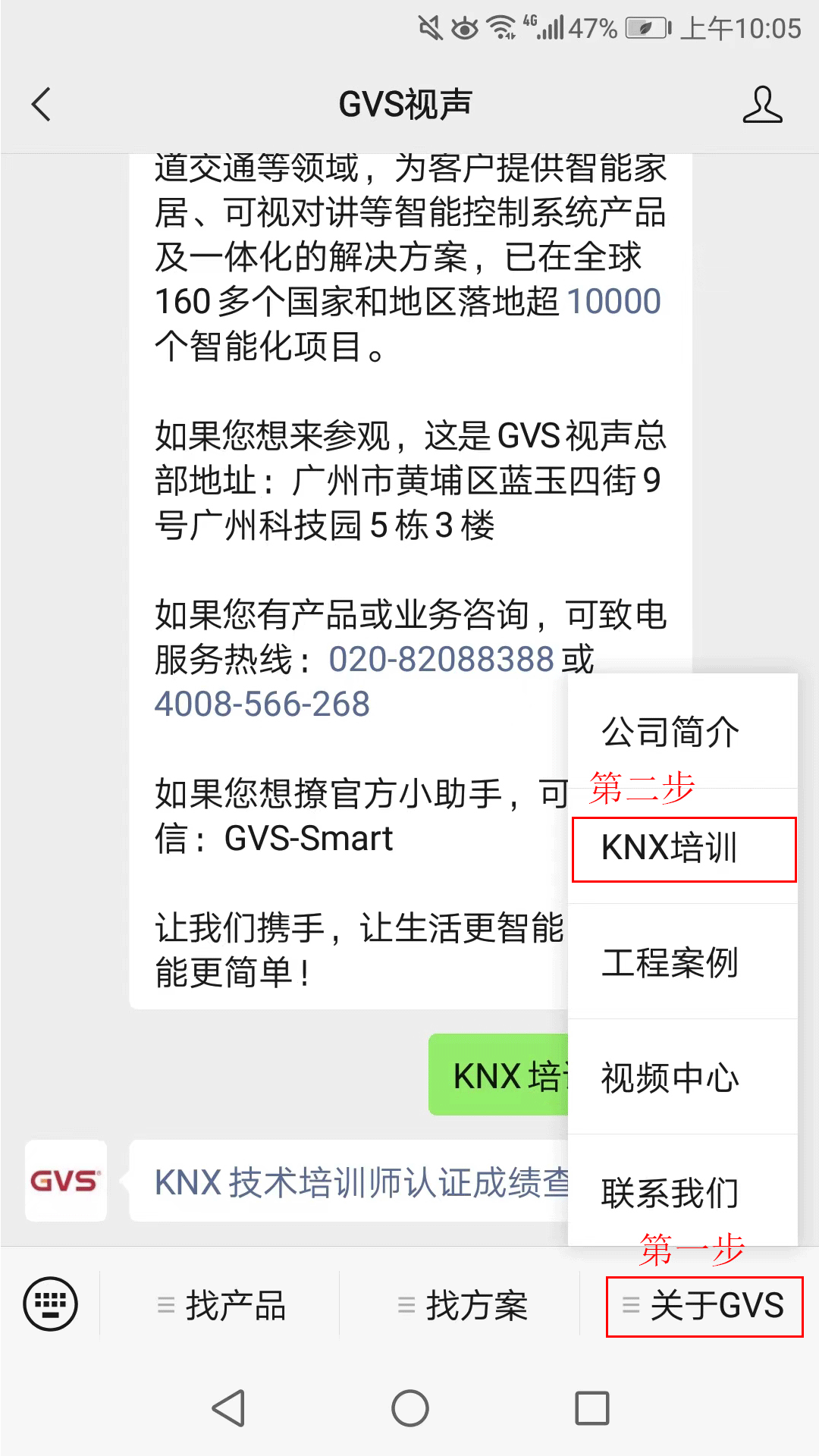 打開(kāi)公眾號(hào)“GVS視聲”會(huì)話窗口,點(diǎn)擊自定義菜單“關(guān)于GVS”,進(jìn)入“KNX培訓(xùn)”,下滑頁(yè)面輸入姓名/KNX賬號(hào)或證書編號(hào)查詢。