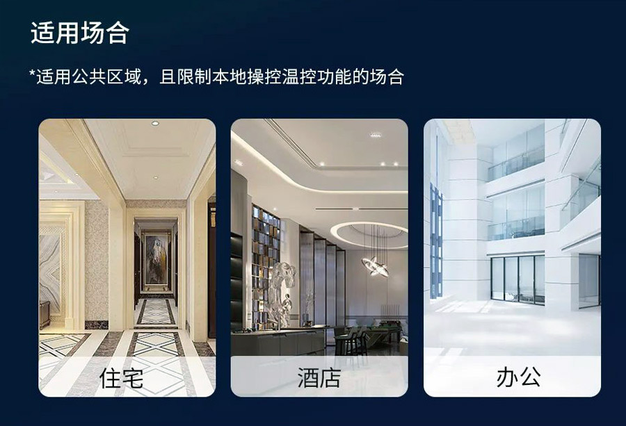 該面板適用于公共區(qū)域,如商場、辦公室等,且限制本地操控溫控功能的場合。其獨特的歐標(biāo)安裝結(jié)構(gòu),適配多品牌面板邊框,讓安裝更加方便快捷。同時,其兩大盤管系統(tǒng)可選——2 管制和4 管制,以及兩路外接傳感器——干接點檢測和 NTC 溫度探測,滿足不同用戶的需求。