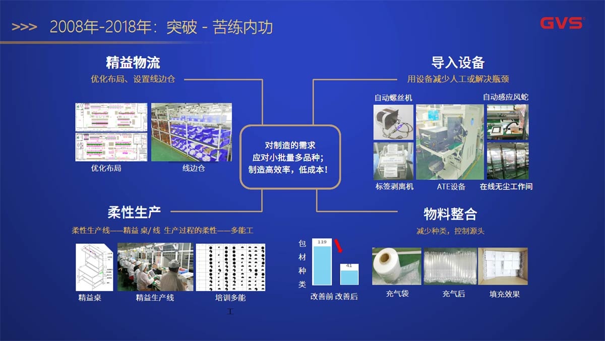 在這第二個十年中,我們成熟了從大批量單一產(chǎn)品的生產(chǎn)模式到小批量多品種生產(chǎn)模式的轉(zhuǎn)換,并且通過改善物流、導(dǎo)入自動化生產(chǎn)線、主動進(jìn)行物料整合,進(jìn)行柔性生產(chǎn)線的改造來苦練內(nèi)功,以應(yīng)對制造模式的改變并堅持為客戶提供高品質(zhì)的服務(wù)。