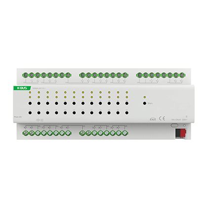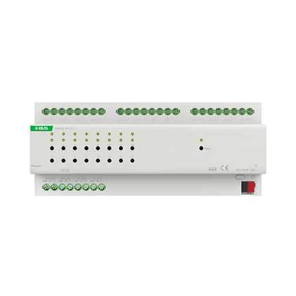 多功能執(zhí)行器是一個多路輸出模塊,集成了多種輸出功能,有開關輸出,窗簾DC/AC輸出,風機輸出和閥門輸出。根據(jù)需求可隨意配置本模塊的功能,比如一部分輸出用于控制開關,一部分輸出用于控制窗簾,一部分輸出用于控制風機等。多功能執(zhí)行器是模塊化安裝設備,為了方便安裝到配電箱中,根據(jù) EN 60 715 設計,能安裝在35毫米的丁導軌上,設備采用螺絲接線柱實現(xiàn)電氣連接,總線連接直接通過 EIB 接線端子連接,系統(tǒng)供電除總 線外不需要額外的電源電壓。