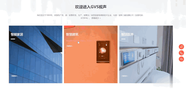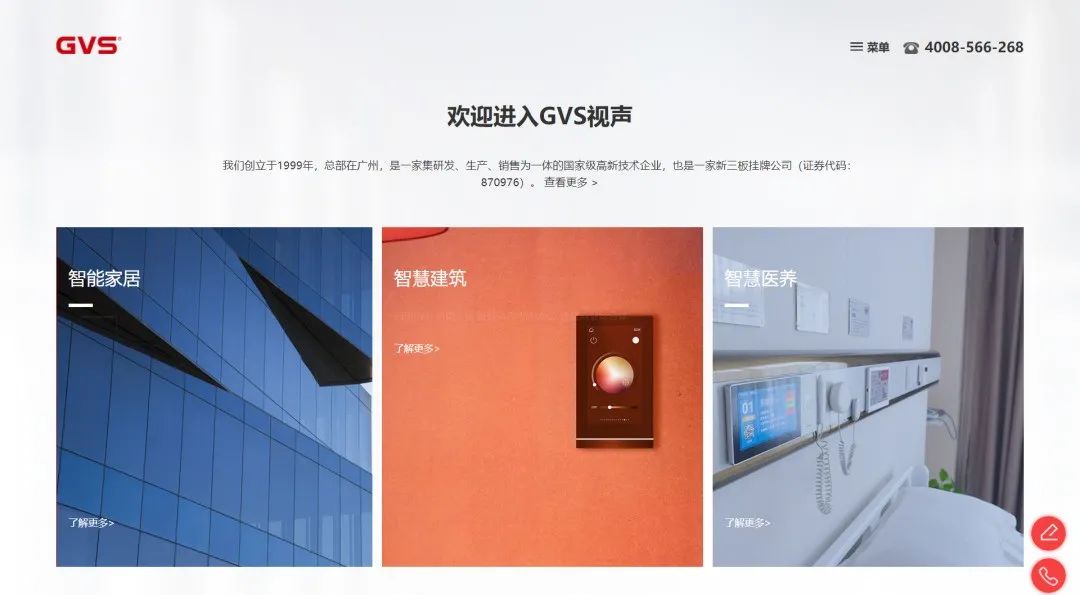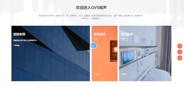 歡迎來(lái)到GVS視聲,很多關(guān)注視聲的朋友都知道,我們的服務(wù)布局3個(gè)領(lǐng)域:智能家居、智慧建筑和智慧醫(yī)養(yǎng)。為了方便大家可以更快地查找相關(guān)業(yè)務(wù)內(nèi)容,我們?cè)谑醉?yè)就設(shè)置了3個(gè)入口,非常直觀,非常簡(jiǎn)單,非常好找。